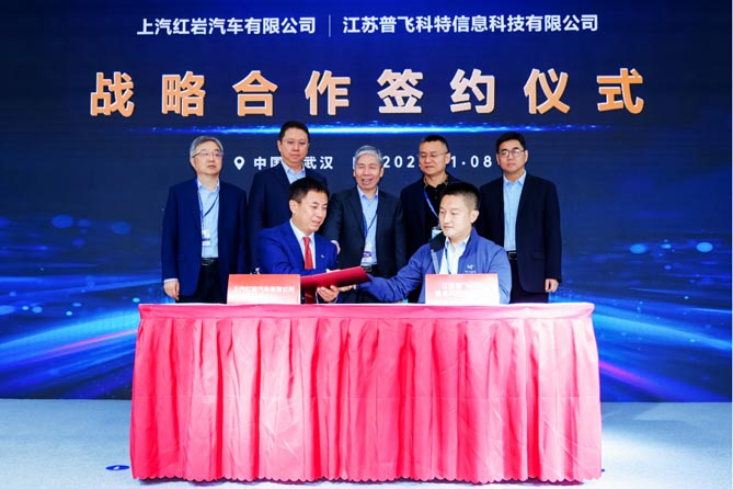 发布会现场,上汽红岩与江苏普飞科特达成合作共识,签约战略协议。未来,双方将充分发挥各自优势,携手并进,共同推动燃气重卡市场推广、产业价值链打造与用户运营生态的建设,共同推进重卡物流领域向清洁能源优化升级,助力区域物流运输发展向新、向绿可持续发展。