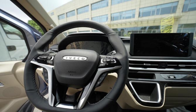 进入车内,聚星多用途乘用车仪表台层次分明的环抱式设计和隐藏式出风口看着很有档次。大面积软包材质的运用及拼色的设计,触感极为舒适。该车还配置了四幅式多功能加热方向盘,10向可调电加热座椅,以及通过NVH静音工程的运用,带来了“剧院级”的静谧空间。此外,12.3寸高清触控大屏搭载了第3代IVECONNECT智能交互系统,集成了腾讯TAI、车载微信、智能导航等功能。一句“你好,小依”即可唤醒AI,实现座椅加热、空调开关及调温、玻璃升降等。先进的车机系统和更多的舒适化配置,无一不在彰显着它的乘用化风格,深受年轻用户喜爱。