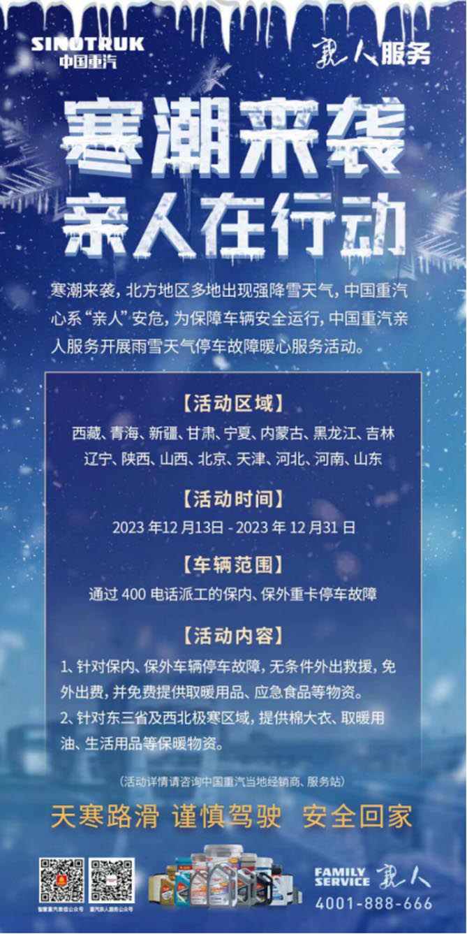 寒潮不寒心,“亲人”在行动。中国重汽始终心系卡友,急“亲人”之所急,关注寒潮之下卡友面临的种种困境,推出“中国重汽‘亲人’服务雨雪天气停车故障暖心服务活动”,携手卡友共战严寒,为卡友保驾护航。