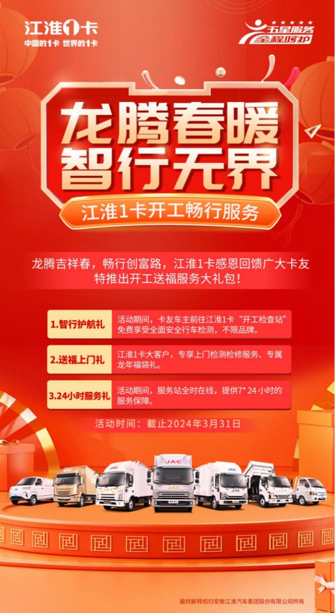 送福上门礼:江淮1卡大客户可专享上门检测检修服务,并可享专属龙年福袋礼。江淮1卡祝您龙腾四海,八方来财!