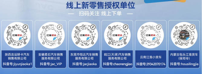 打开抖音扫码关注或搜索以下任意一家授权单位即可快速下单。下单后,购车流程透明、速度更快。江淮1卡会将车辆运输至您所在城市,并由当地江淮1卡经销商联系您交尾款、提车。线上下单、线下包邮到家,买车方便省心!