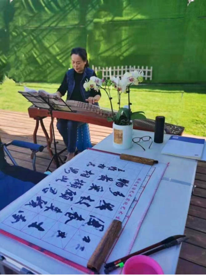 何女士正在弹古筝,其先生在旁写书法