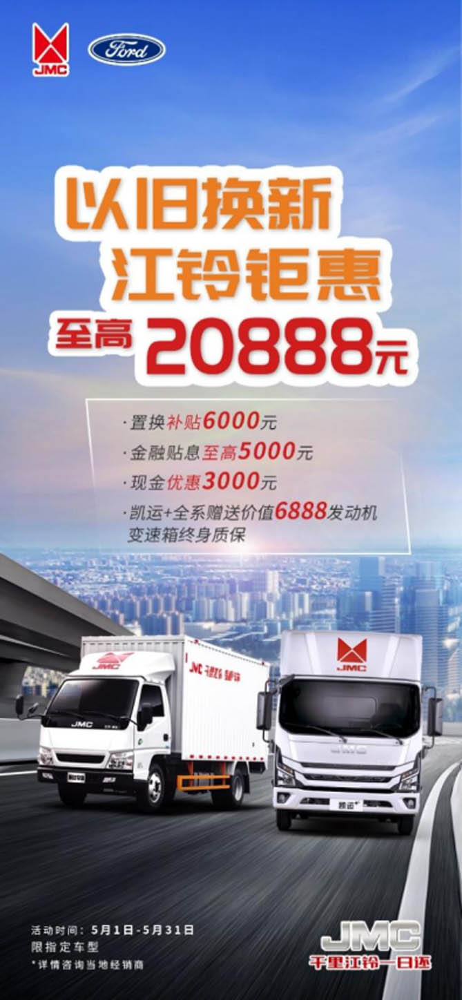 进入5月,江铃轻卡官方出炉的“以旧换新”置换补贴政策落地,一套大力度优惠“组合拳”点燃了卡友们的购车热情。用户在活动期间置换指定的车型即可享受置换补贴、金融贴息、现金优惠、发动机变速箱终身质保等专属福利,至高可享20888元补贴。