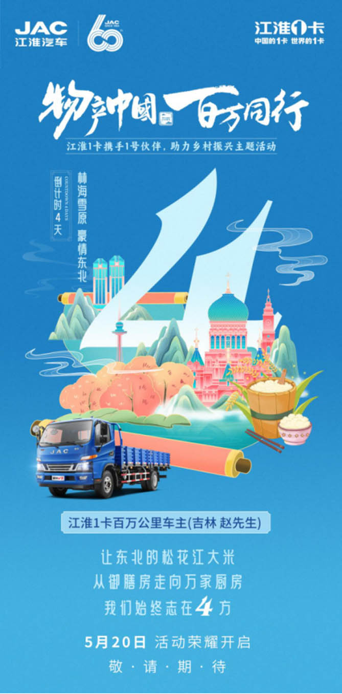 甲子JAC,1卡献礼!“物产中国 百万同行——江淮1卡携手1号伙伴,助力乡村振兴主题活动”首站发车仪式将于5月20日在安徽省合肥市隆重举行。据悉,首站活动江淮1卡将携手合肥市蜀山区文旅局、合肥市肥西县文旅局、安徽本地老乡鸡品牌,以及来自全国各地的高里程卡友、媒体朋友们,共同讲述“国家地理标志保护产品——老乡鸡”的故事,传递同行的力量。