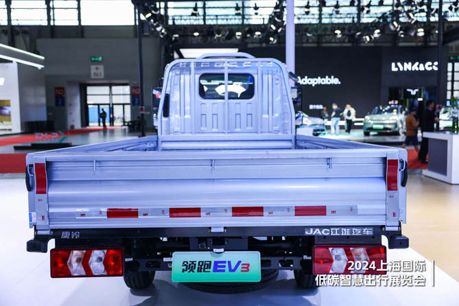 在卡友颇为关注的动力和续航方面,现场展出的是领跑EV3 41.86度电栏板车型,采用宁德时代第三代单包动力电池,8年40万保养,无后顾之忧,匹配最大功率77kw、最大扭矩230N·m的扁线电机以及自动挡变速箱,配合江淮自产电控系统,纯电续航达230km。承载方面,领跑EV3依托领先的新能源小卡专属平台,材质为宝钢高强钢,一次冲压成型更耐压;1000mm开档,超宽底盘匹配后单胎,行车更稳定;平行轴式电驱桥自重轻能耗低,十万公里长换油保养省,最大承载3T。