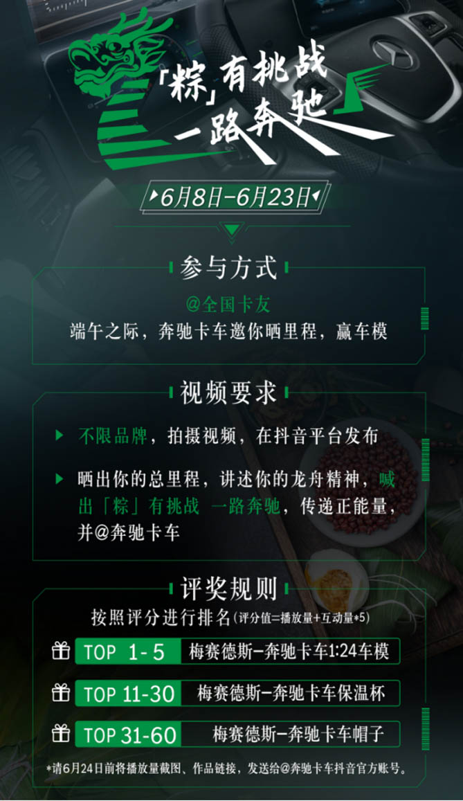 近日,梅赛德斯-奔驰卡车于6月8日-6月23日期间推出“「粽」有挑战 一路奔驰”晒里程、赢车模有奖活动,诚邀全国卡友通过拍摄视频讲述龙舟精神,传递卡车人的正能量。如欲了解详情,请观阅下方活动规则。