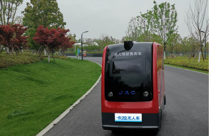 目前,卡拉无人车凭借科技感的造型、呆萌的长相以及智能的人际交互和无人售卖功能,已经在合肥骆岗公园等景点与广大游客见面,服务于广大游客,实现示范化运营。另外,江淮无人充电车,标配65度电池包,以自动适应充电功率、移动便捷、快速补能等优势,为新能源车辆解决充电问题,在江淮1卡高端与纯电动轻卡生产基地内随处可见。