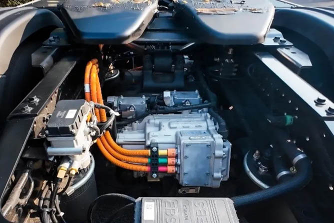 整体车桥通过驱动电机与4挡AMT变速箱一体化设计,在实现车桥轻量化的基础上,具有抗振荡冲击能力强、系统能量损失小、传动效率高等优势,支持整车最高车速120km/h,最大整车爬坡度>30%。