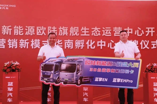 同时在活动现场,欧陆(深圳)新能源科技有限公司与融盛天翼深圳汽车服务有限公司进行30台蓝擎新能源轻卡交车仪式,也意味着蓝擎新能源轻卡在深圳市场受到客户持续追捧。