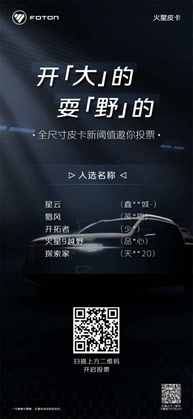 7月25日-8月5日,火星皮卡在皮卡生活APP和官方微信公众号平台发起命名评选,扫描下方二维码不仅可以为自己心仪的命名打call,更有机会获得由官方送出的神秘大奖!