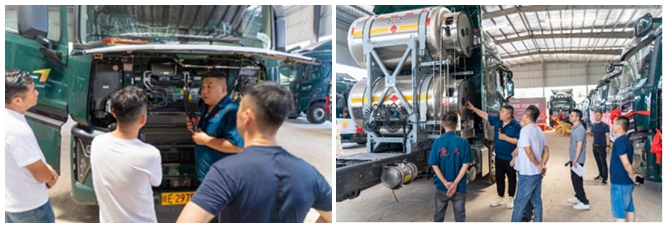 随后,中国重汽服务经理为车队长提供了详尽的交车前培训,此次交付的是豪沃MAX/4×2快递燃气车型,匹配WP13NG-4.0燃气发动机,发动机扭矩达到2300NM,热效率最高可达54.16%,真正将动力强劲、经济节能做到极致;同时,车辆搭载集成式自动挡变速箱+MCY系列车桥,采用16挡精密设计,速比级差精细至1.2,确保发动机时刻处于最佳经济区间运行。交车培训过程中,双方针对发动机、变速箱、前后桥保养间隔及气瓶使用等相关问题,进行了详细的沟通和交流。
