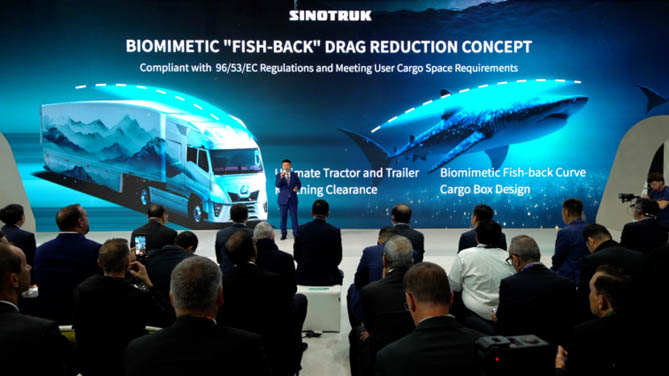 其中全新发布升级的黄河氢内燃机牵引列车,将精细化设计和尖端智能科技巧妙融合,以震撼业界之举:风阻系数降至0.286Cd,整车节能可达15%,彰显中国智造的非凡力量与无限可能!汕德卡氢燃料电池牵引车,由中国重汽自主开发氢燃料电池系统、电驱桥、整车控制和变速控制等一系列尖端技术,续航里程可达1200公里,全程运行实现零碳排放。中国重汽HOWO统帅PRO纯电轻卡,深度融合智能化技术,为用户带来前所未有的安全、智能的驾驶新体验。这组车型的展出,是中国重汽为积极响应全球低碳零排放的时代潮流所提交的中国答卷。中国重汽将继续携手全球各界伙伴,深化交流合作,开创互利共赢、协同发展的新局面。