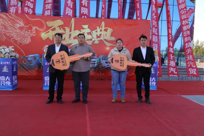 为深入贯彻落实习近平总书记对内蒙古打造我国向北开放重要桥头堡的重要指示精神,按照中国兵器工业集团与内蒙古自治区政府合作协议的指导意见,在中国兵器“蒙煤一体化项目”的具体要求下,阿拉善盟行署与北奔重汽政企联合共同制定额济纳旗策克口岸工作方案。北奔重汽、北方车辆积极履行央企职责,充分发挥内蒙古自治区本土汽车制造企业和新能源汽车产业促进会的专业化优势,联合产业链合作伙伴在策克口岸投资建设自治区首个商用车口岸服务中心,并于10月16日上午,隆重举行北奔重汽策克口岸车辆销售服务中心开业庆典剪彩、车辆交付仪式。