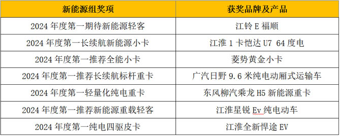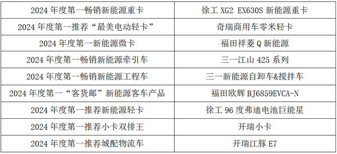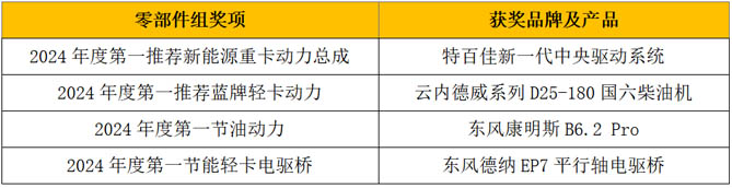 此外,为了推动商用车行业加快向新能源化方向发展,今年的新能源组评选设置了“2024年度第一畅销新能源重卡”、“2024年度第一推荐长续航标杆重卡”、“2024年度第一畅销新能源牵引车”、“2024年度第一畅销新能源工程车”、“2024年度第一推荐新能源重载轻客”、“2024年度第一推荐全能小卡”、“2024年度第一推荐城配物流车”、“2024年度第一长续航新能源小卡”、“2024年度第一期待新能源轻客”、“2024年度第一纯电四驱皮卡”等奖项。在零部件领域,本次评选设置了“2024年度第一推荐蓝牌轻卡动力”、“2024年度第一推荐新能源重卡动力总成”、“2024年度第一节油动力”、“2024年度第一节能轻卡电驱桥”等重磅奖项。