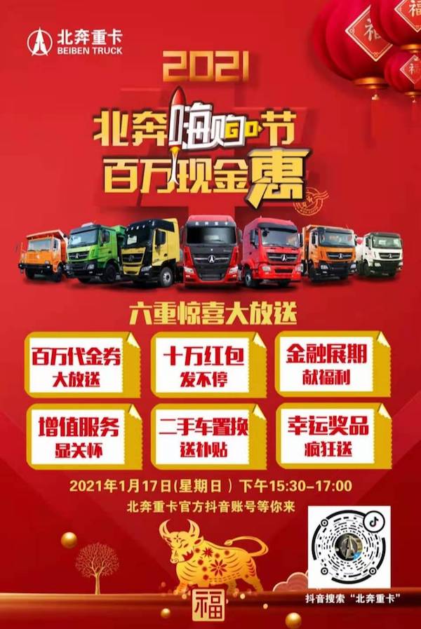 2021年1月17日,15:30-17:00,以“北奔嗨购节 百万现金惠”为主题的线上直播活动将在北奔重卡官方抖音账号进行直播。