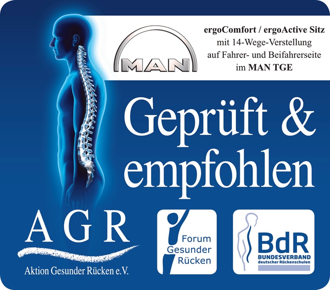 对于卡车驾驶员来说,长时间的驾驶是家常便饭。由此而来的腰酸背痛、腿部酸麻、头痛等等身体不适都会影响到他们的工作状态,因此一个舒适的座椅显得尤为重要。作为脊背健康产品的“推荐大师”,德国脊背健康协会(AGR)对曼恩TGE上搭载的悬浮座椅“ErgoActive”和对乘客脊椎健康友好的“ErgoComfort”给予了认证。