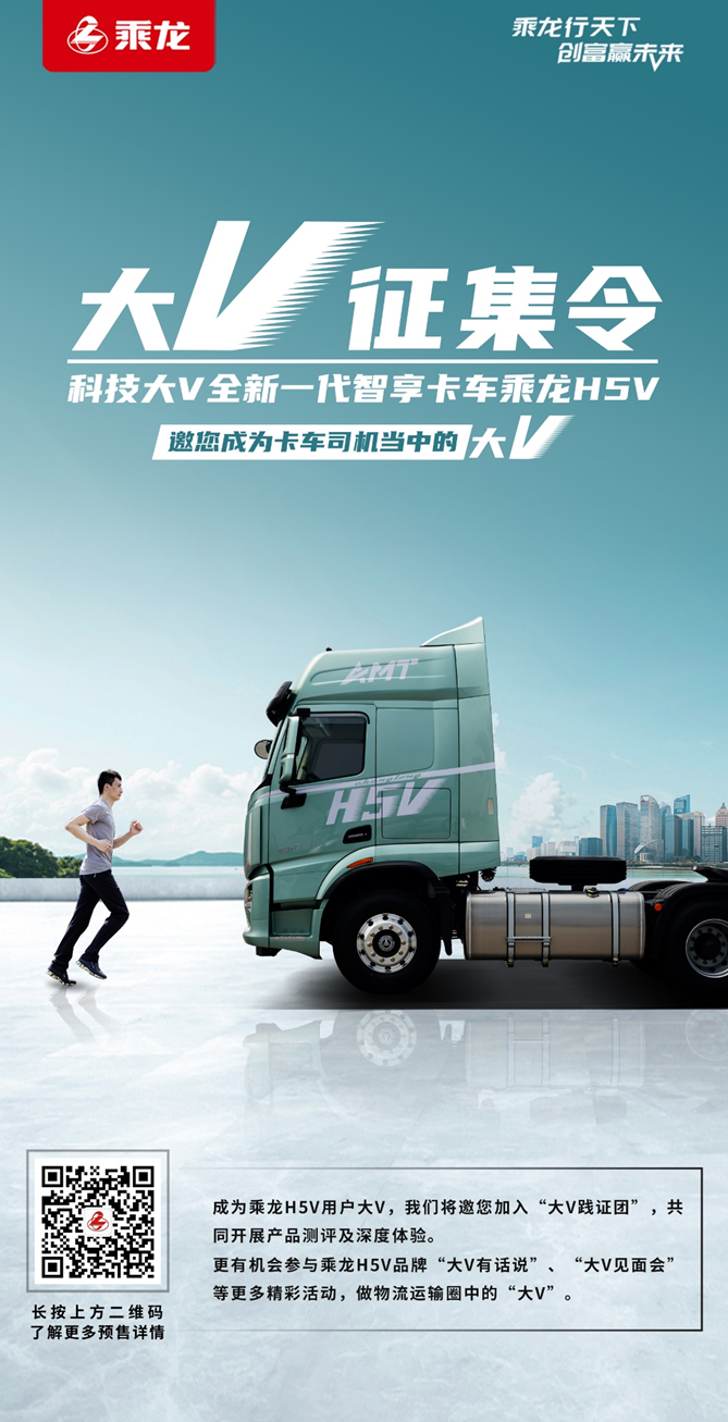 享预售福利,做“用户大V”!扫描下方二维码,马上订购乘龙H5V,抢先体验乘龙全新产品,开启属于卡友自己的V时代,做物流运输圈中的“大V”。