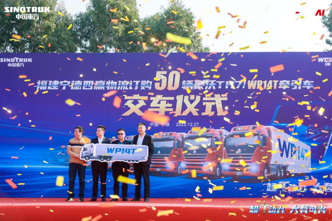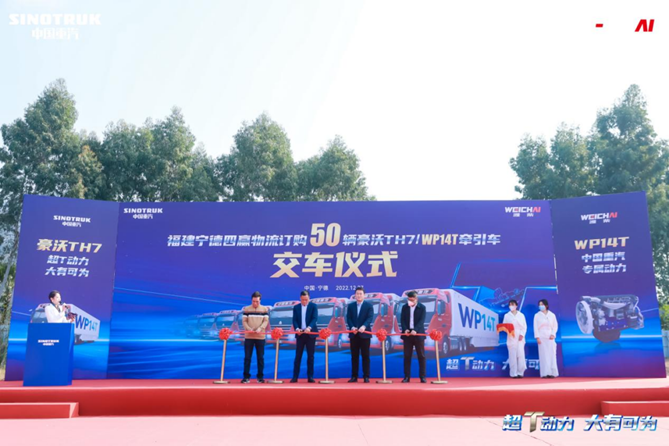 2022年12月27日,50辆豪沃TH7/WP14T/610马力牵引车交车仪式在福建宁德隆重举行。各方代表与媒体记者出席仪式,共同见证交车荣耀时刻。开启新篇章,驶向新征程!