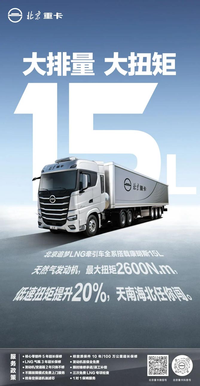 以i-Beijing整车数智统领,搭载全球同步的康明斯X15N燃气发动机和采埃孚第4代TraXon自动变速箱。