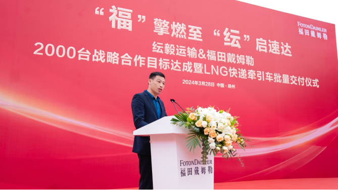 2024年3月28日,以“褔擎燃至 纭启速达”为主题的纭毅运输&福田戴姆勒2000台战略合作目标达成暨LNG牵引车批量交付仪式在江苏扬州圆满举行。宝应县政府、北京福田戴姆勒汽车有限公司、纭毅纭庆(扬州)运输有限公司、优秀驾驶员以及客户代表共同出席了本次交车活动。