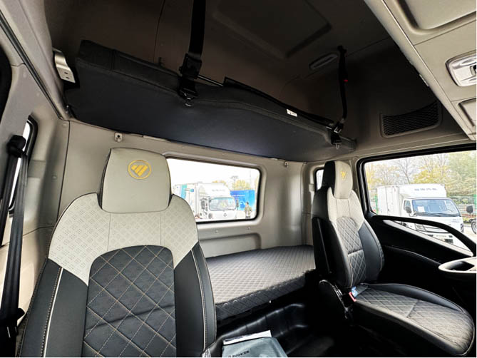 打开驾驶室,可以看到纯电产品带来的首要优势,驾驶室采用平地板设计,卡友可以轻松在主副驾驶位之间移动。在高顶驾驶室的加持下,整车拥有非常充足的活动空间。