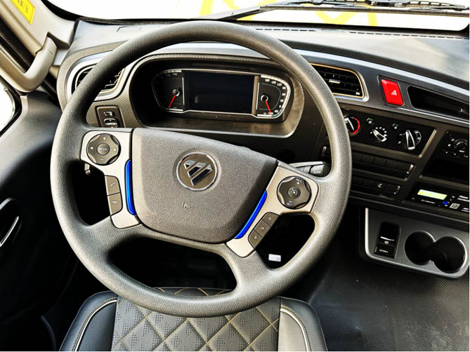 多功能方向盘采用镀铬和蓝色饰条装饰,软包设计为卡友提供了良好的质感。方向盘具有定速巡航、蓝牙电话等功能,按键布局符合人体工程学设计。该车型采用怀挡设计,增加了驾驶室空间,并减轻了卡友的操作负担。中控区下方设有杯托和电子手刹功能,为卡友的日常运营提供便利。