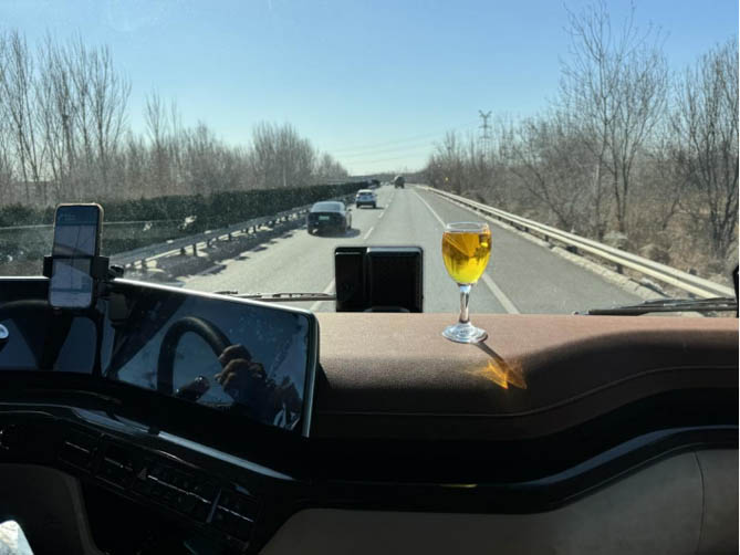 在行驶过程中,测试人员在重卡中控台放置了一个空高脚杯和一个装满饮料的高脚杯,在加减速的情况下,竟达到了“空杯不倒、满杯不洒”的效果,平稳性显而易见,为运输企业带来了更加可靠、高效的运输解决方案。