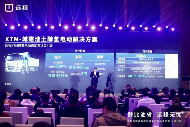 活动展车现场,远程X7M醇氢电动自卸车吸引了不少用户的目光,该车针对基建渣土运输工程场景打造,搭载170kW级醇氢电动+玄武高性能专用电池的动力组合,和纯电重卡拥有同等新能源路权,单次补能续航超过600km,是纯电车型的3倍,部分场景高效出勤可较纯电车型每天多拉一趟。车辆电机功率达410kW,轻松应对任何泥泞道路和脱困场景,搭载高强度复合车架、多片簧、整体式平衡轴提升底盘承载能力,确保用户高效出勤。补能方面,醇氢加注站建设周期短、投资成本低、占用面积小,非常契合场景痛点。目前远程X7M醇氢电动自卸车批量投运市场,助力高效绿色城建发展,方公里成本比燃油下降 50%,每公里综合成本小于2元,与纯电相比单车出勤效率提高 20% 以上,5年TCO增收50万以上。