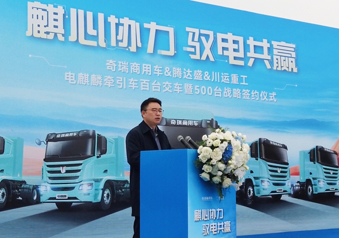 2026年3月12日,以“麒心协力 驭电共赢”为主题的奇瑞商用车&腾达盛&川运重工电麒麟牵引车百台交车暨500台战略签约仪式在四川德阳隆重举行。现场电麒麟牵引车整齐列阵,共启西南绿色物流迈向规模化运营的关键一步。