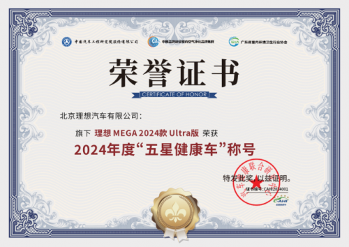 “五星健康车” 是由汽车健康联合研究中心基于中国汽车健康测评指数(C-AHI)结果颁发的荣誉称号,也是目前国内汽车市场中的健康乘用车荣誉形象。在2023版测评新规程中,理想MEGA和理想L6双双拿下“五星+”的最高评级,且分别位居纯电车型和混动车型历史第一名,拿到了双状元。在清新空气、健康防护和绿色出行三个维度均获得最高评级,为全家人提供全方位的健康环境。