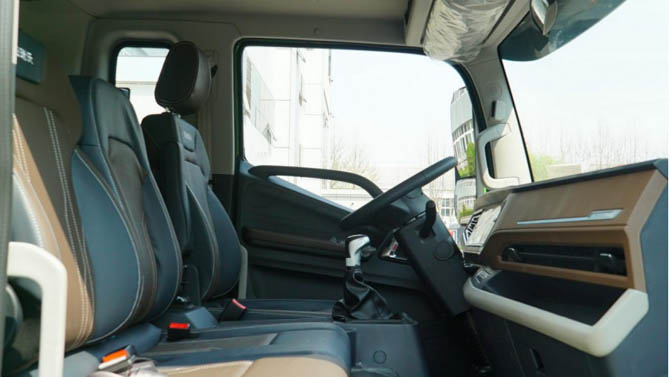 内饰同样进行了全新开发设计。标志性的特征就是中控台,7英寸液晶仪表+10.25英寸多媒体屏镶嵌其中,这也是同类车型首次应用双联屏,视觉效果更像是一辆SUV的驾驶舱,时尚范儿拉满。中控大屏内置360°全景环视、语音识别、双屏互动、多种APP智能应用以及货运平台对接等场景化服务,使用体验完全媲美新能源乘用车,卡友的工程运输生活也变得更加丰富多彩。